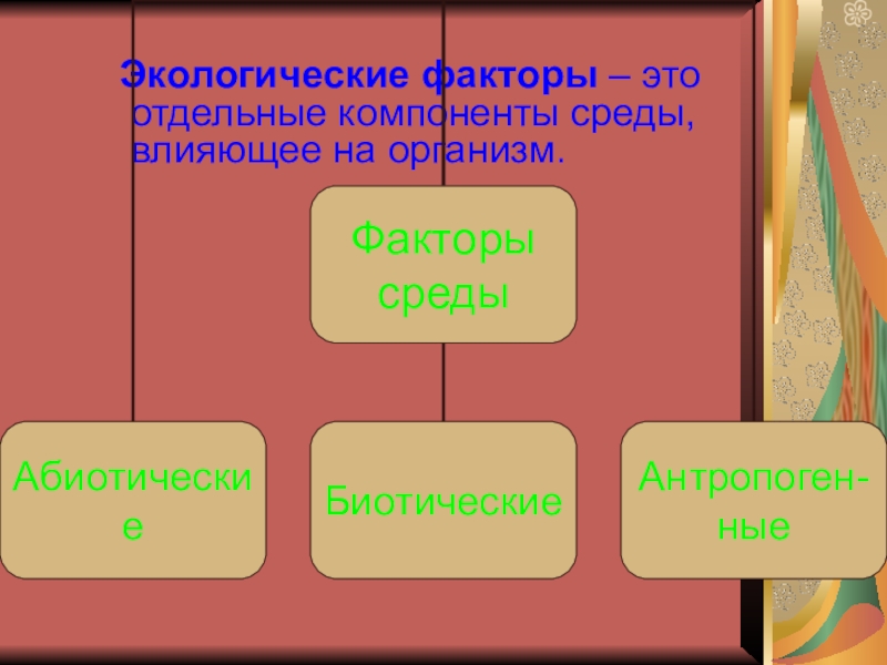 Слайд 2 Экологические факторы – это отдельные компоненты среды, влияющее на организм.