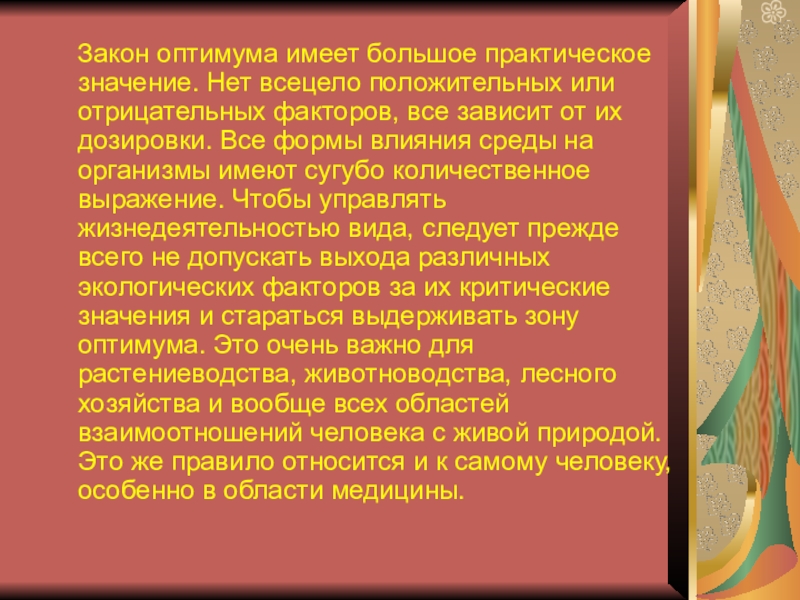 или отрицательных факторов, все зависит от их дозировки. Все формы влияния среды на организмы имеют сугубо количественное выражение. Чтобы управлять жизнедеятельностью вида, следует прежде всего не допускать выхода различных экологических факторов за их критические значения и стараться выдерживать зону оптимума. Это очень важно для растениеводства, животноводства, лесного хозяйства и вообще всех областей взаимоотношений человека с живой природой. Это же правило относится и к самому человеку, особенно в области медицины.