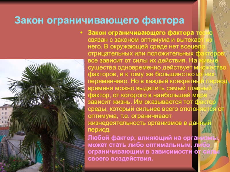 Любой фактор, влияющий на организмы, может стать либо оптимальным, либо ограничивающим в зависимости от силы своего воздействия.