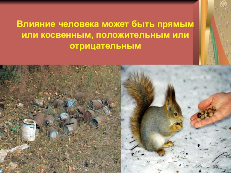 Слайд 7Влияние человека может быть прямым или косвенным, положительным или отрицательным
