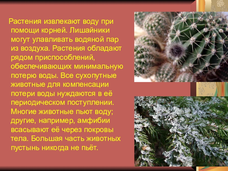 водяной пар из воздуха. Растения обладают рядом приспособлений, обеспечивающих минимальную потерю воды. Все сухопутные животные для компенсации потери воды нуждаются в её периодическом поступлении. Многие животные пьют воду; другие, например, амфибии всасывают её через покровы тела. Большая часть животных пустынь никогда не пьёт.