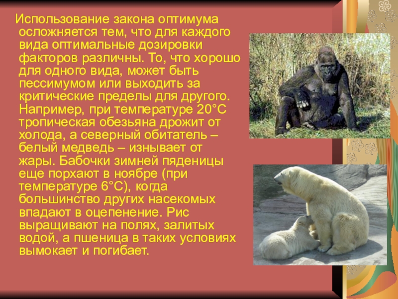 оптимальные дозировки факторов различны. То, что хорошо для одного вида, может быть пессимумом или выходить за критические пределы для другого. Например, при температуре 20°C тропическая обезьяна дрожит от холода, а северный обитатель – белый медведь – изнывает от жары. Бабочки зимней пяденицы еще порхают в ноябре (при температуре 6°C), когда большинство других насекомых впадают в оцепенение. Рис выращивают на полях, залитых водой, а пшеница в таких условиях вымокает и погибает.