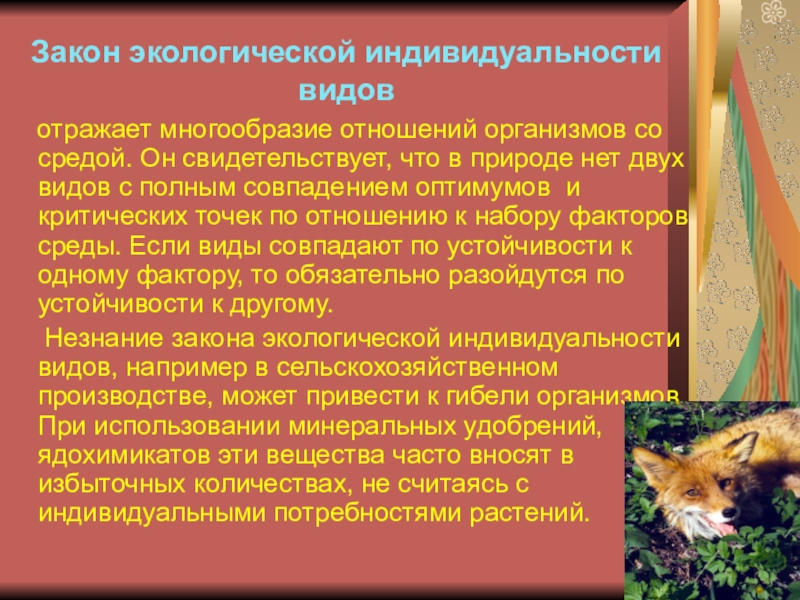 Слайд 19Закон экологической индивидуальности видов