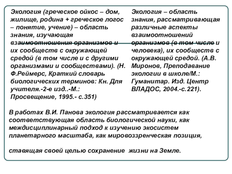 В работах В.И. Панова экология рассматривается как соответствующая область биологической науки, как междисциплинарный подход к изучению экосистем планетарного масштаба, как мировоззренческая позиция,
