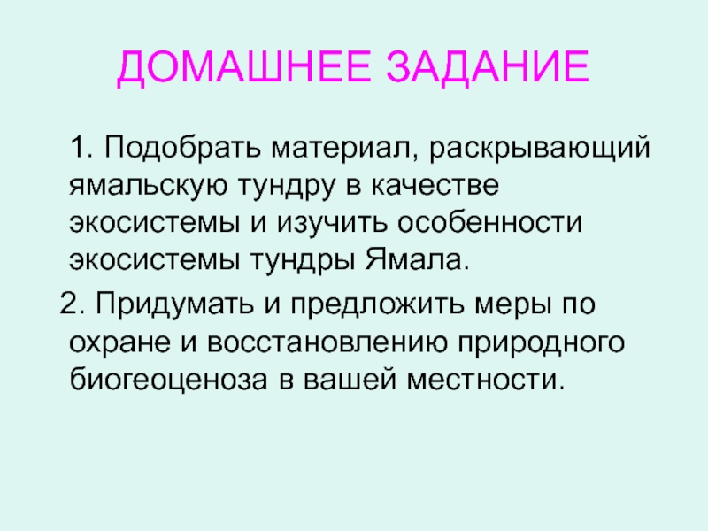 ДОМАШНЕЕ ЗАДАНИЕ  1. Подобрать материал, раскрывающий ямальскую тундру в качестве экосистемы и изучить особенности экосистемы тундры