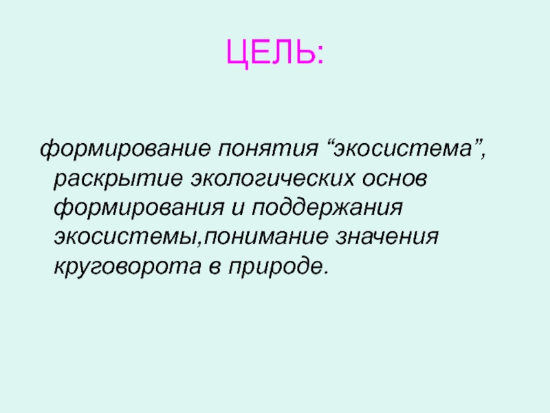 ЦЕЛЬ: формирование понятия “экосистема”, раскрытие экологических основ формирования и поддержания экосистемы,понимание значения круговорота в природе.