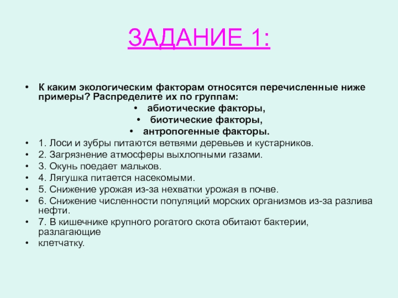 ЗАДАНИЕ 1:К каким экологическим факторам относятся перечисленные ниже примеры? Распределите их по группам: абиотические факторы,биотические факторы,антропогенные факторы.1.
