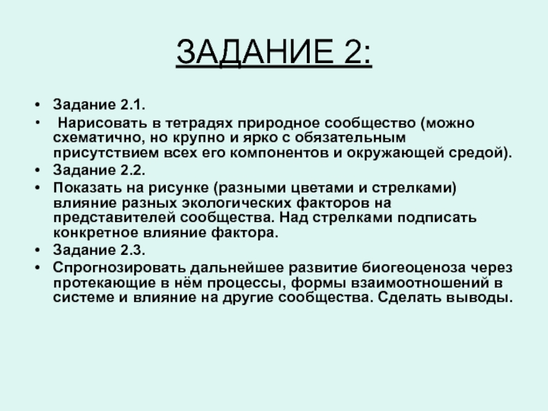 ЗАДАНИЕ 2:Задание 2.1. Нарисовать в тетрадях природное сообщество (можно схематично, но крупно и ярко с обязательным присутствием