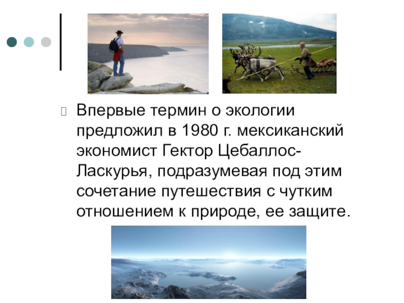 Впервые термин о экологии предложил в 1980 г. мексиканский экономист Гектор Цебаллос-Ласкурья, подразумевая под этим сочетание путешествия