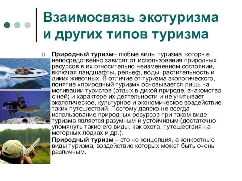 Взаимосвязь экотуризма и других типов туризмаПриродный туризм– любые виды туризма, которые непосредственно зависят от использования природных ресурсов