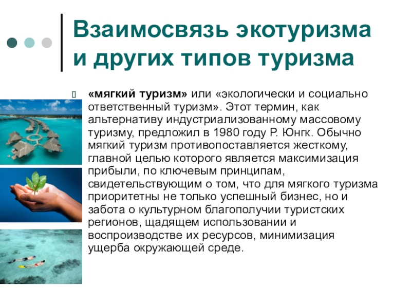 Взаимосвязь экотуризма и других типов туризма«мягкий туризм» или «экологически и социально ответственный туризм». Этот термин, как альтернативу