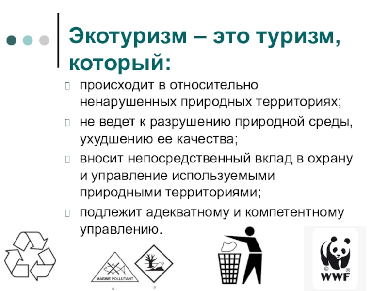 Экотуризм – это туризм, который:происходит в относительно ненарушенных природных территориях; не ведет к разрушению природной среды, ухудшению