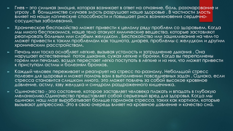 Каждый человек переживает и реагирует на стресс по-разному. Небольшой стресс полезен для здоровья и может помочь вам в выполнении повседневных задач . Однако, если стресса становится слишком много, это может повлечь за собой высокое кровяное давление, астму, язву желудка и синдром раздраженного кишечника.