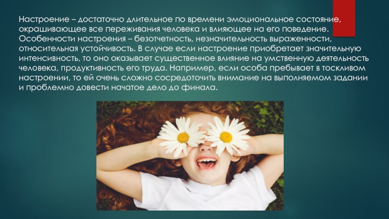 Слайд 10Настроение – достаточно длительное по времени эмоциональное состояние, окрашивающее все переживания