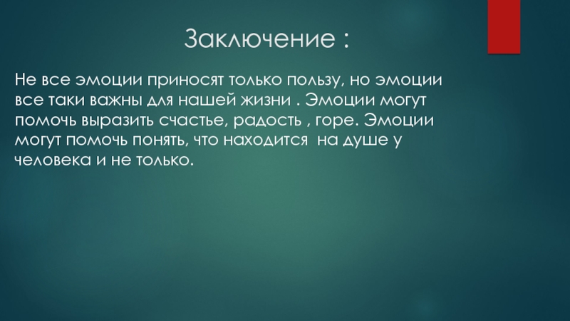 важны для нашей жизни . Эмоции могут помочь выразить счастье, радость , горе. Эмоции могут помочь понять, что находится на душе у человека и не только.