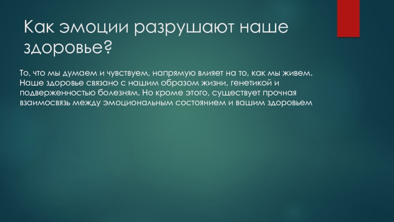 влияет на то, как мы живем. Наше здоровье связано с нашим образом жизни, генетикой и подверженностью болезням. Но кроме этого, существует прочная взаимосвязь между эмоциональным состоянием и вашим здоровьем