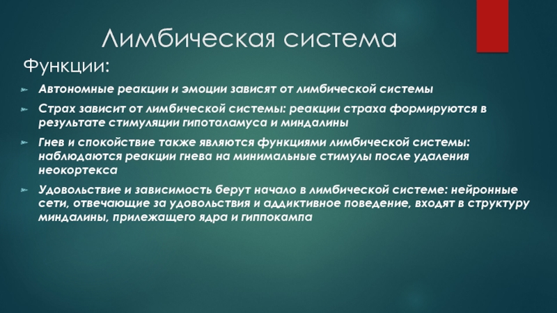 Удовольствие и зависимость берут начало в лимбической системе: нейронные сети, отвечающие за удовольствия и аддиктивное поведение, входят в структуру миндалины, прилежащего ядра и гиппокампа
