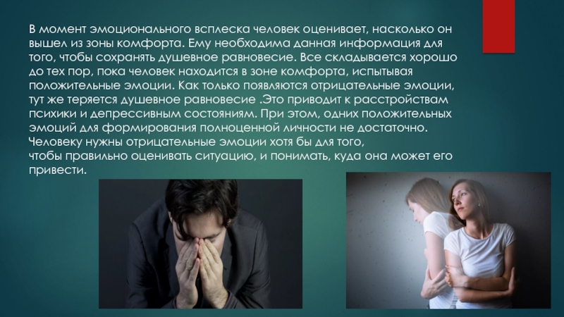 комфорта. Ему необходима данная информация для того, чтобы сохранять душевное равновесие. Все складывается хорошо до тех пор, пока человек находится в зоне комфорта, испытывая положительные эмоции. Как только появляются отрицательные эмоции, тут же теряется душевное равновесие .Это приводит к расстройствам психики и депрессивным состояниям. При этом, одних положительных эмоций для формирования полноценной личности не достаточно. Человеку нужны отрицательные эмоции хотя бы для того, чтобы правильно оценивать ситуацию, и понимать, куда она может его привести.