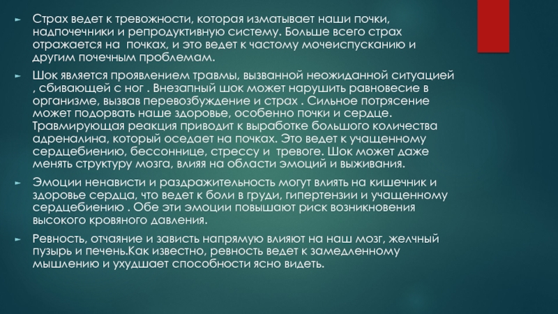Слайд 15Страх ведет к тревожности, которая изматывает наши почки, надпочечники и репродуктивную