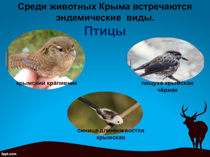 Слайд 3Среди животных Крыма встречаются эндемические виды. Птицы