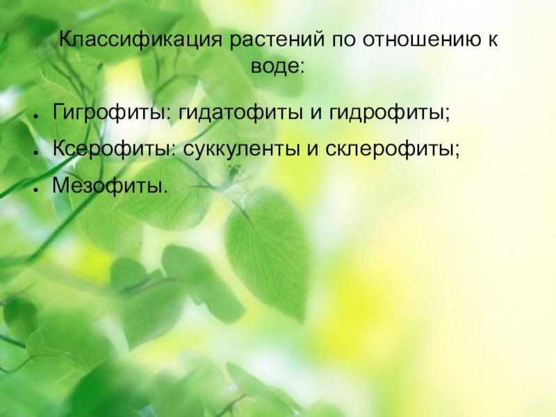 Классификация растений по отношению к воде:Гигрофиты: гидатофиты и гидрофиты;Ксерофиты: суккуленты и склерофиты;Мезофиты.