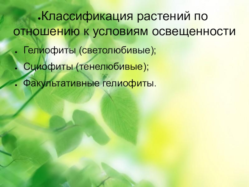Классификация растений по отношению к условиям освещенностиГелиофиты (светолюбивые);Сциофиты (тенелюбивые);Факультативные гелиофиты.