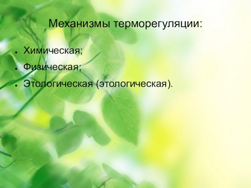 Механизмы терморегуляции:Химическая;Физическая;Этологическая (этологическая).