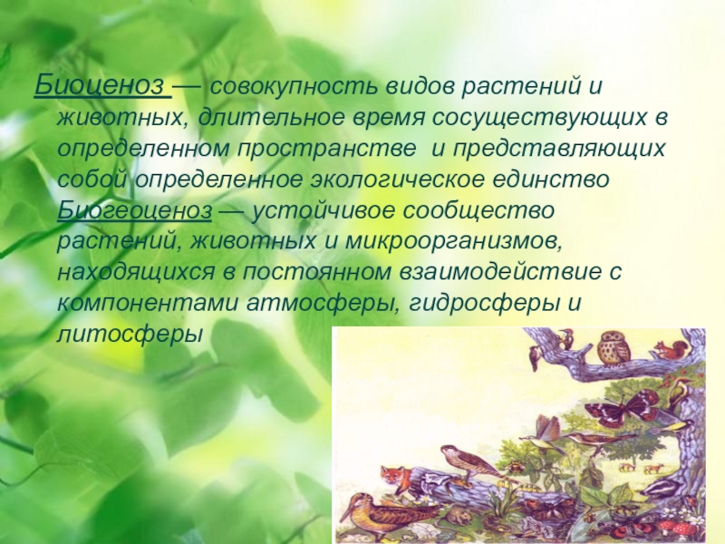 определенном пространстве и представляющих собой определенное экологическое единство Биогеоценоз — устойчивое сообщество растений, животных и микроорганизмов, находящихся в постоянном взаимодействие с компонентами атмосферы, гидросферы и литосферы