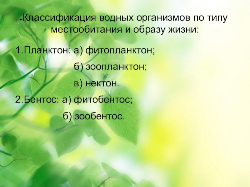 Классификация водных организмов по типу местообитания и образу жизни:1.Планктон: а) фитопланктон;