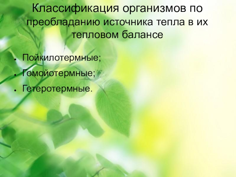 Классификация организмов по преобладанию источника тепла в их тепловом балансеПойкилотермные;Гомойотермные;Гетеротермные.