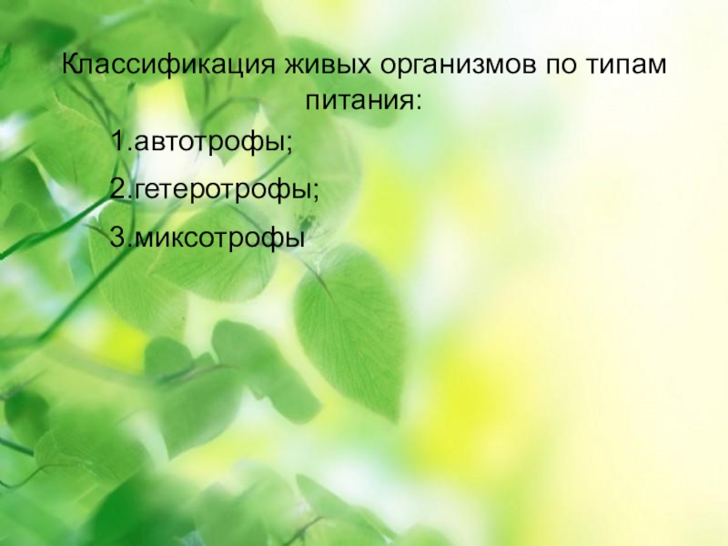 Классификация живых организмов по типам питания:1.автотрофы;2.гетеротрофы;3.миксотрофы