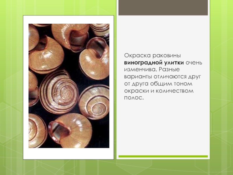 Слайд 17Окраска раковины виноградной улитки очень изменчива. Разные варианты отличаются друг от