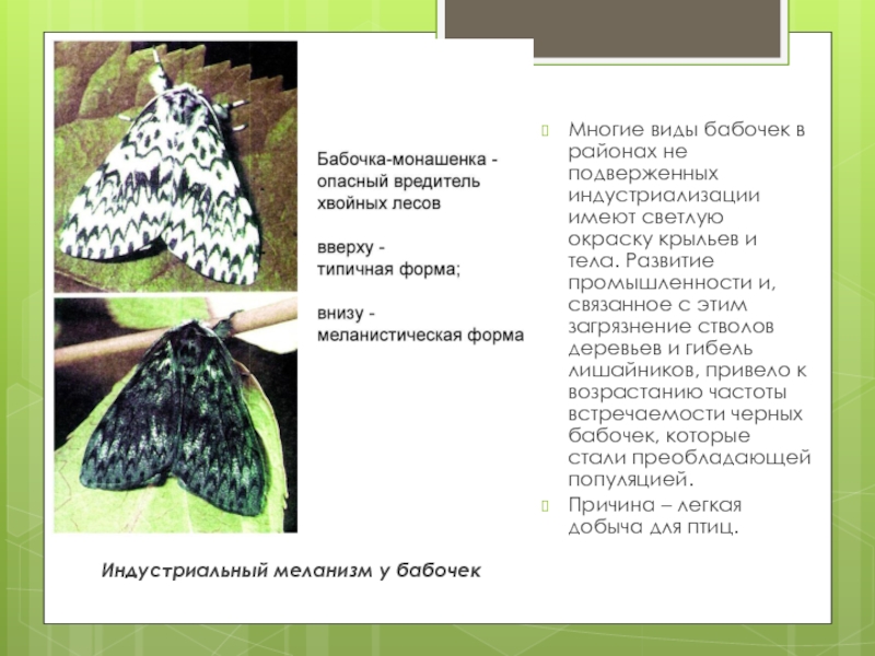 Слайд 11Индустриальный меланизм у бабочек