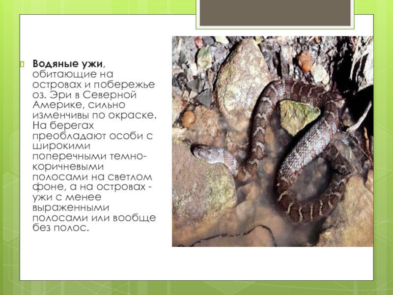 Слайд 16Водяные ужи, обитающие на островах и побережье оз. Эри в Северной