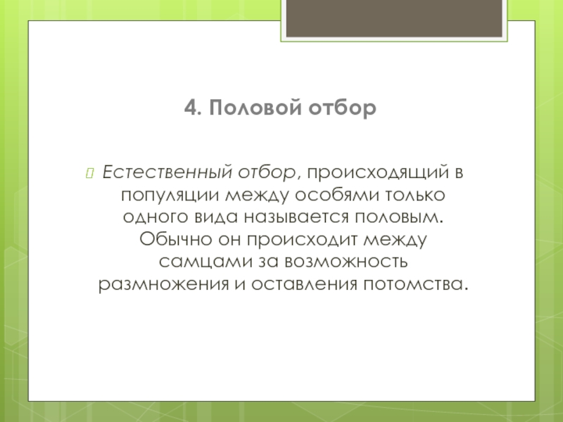 Слайд 20Половой отбор – это не самостоятельный фактор эволюции, а частный случай