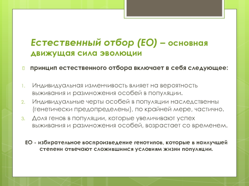 ЕО - избирательное воспроизведение генотипов, которые в наилучшей степени отвечают сложившимся условиям жизни популяции.