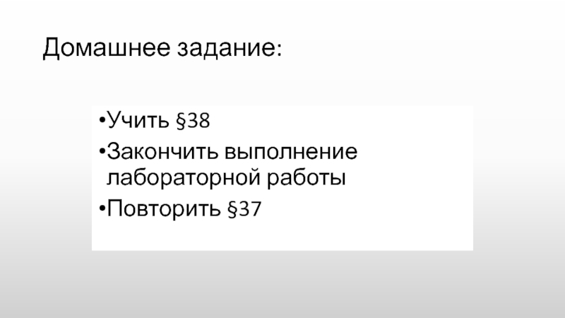 Домашнее задание:Учить §38Закончить выполнение лабораторной работыПовторить §37