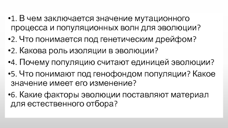 1. В чем заключается значение мутационного процесса и популяционных волн для эволюции?2. Что понимается под генетическим дрейфом?2.