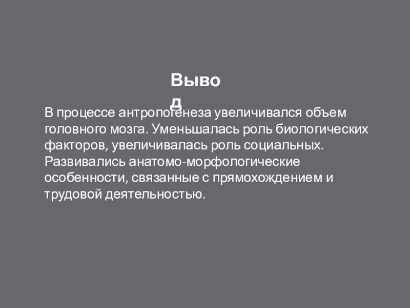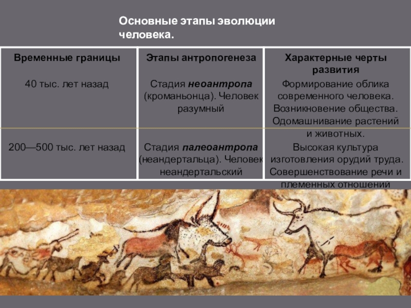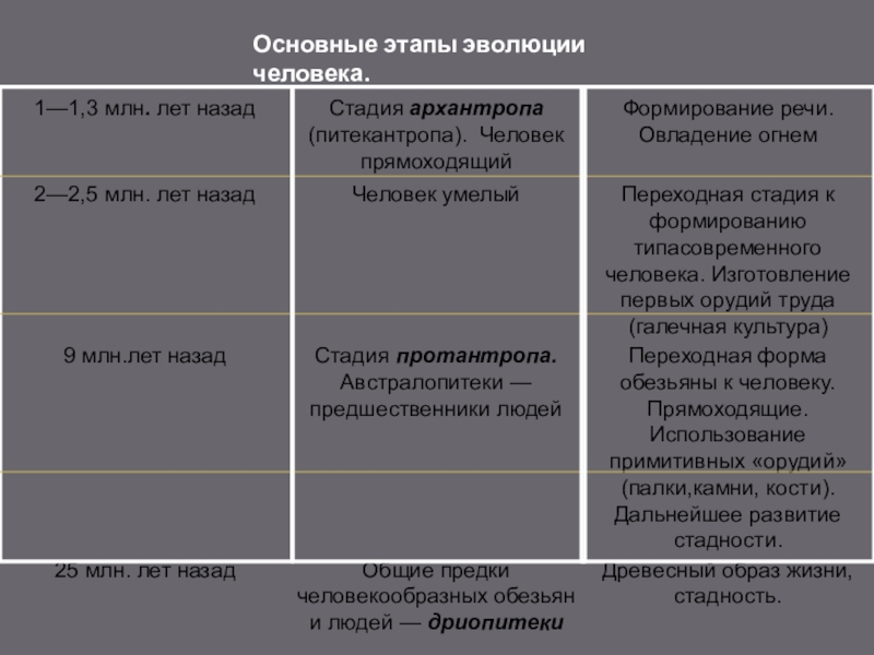 Становление человека как биологического вида проходило через четыре основных этапа — предшественник человека (про-тантроп); древнейший человек (архантроп); древний человек (палеоантроп); человек современного типа (неоантроп).