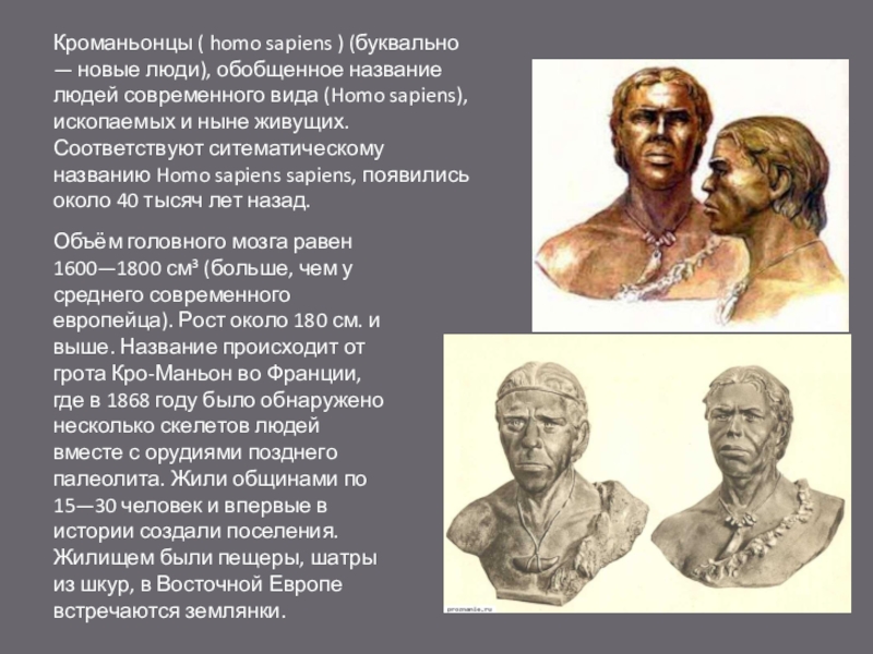 Объём головного мозга равен 1600—1800 см³ (больше, чем у среднего современного европейца). Рост около 180 см. и выше. Название происходит от грота Кро-Маньон во Франции, где в 1868 году было обнаружено несколько скелетов людей вместе с орудиями позднего палеолита. Жили общинами по 15—30 человек и впервые в истории создали поселения. Жилищем были пещеры, шатры из шкур, в Восточной Европе встречаются землянки.