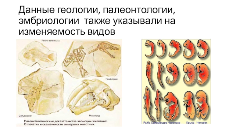 Слайд 4Данные геологии, палеонтологии, эмбриологии также указывали на изменяемость видов