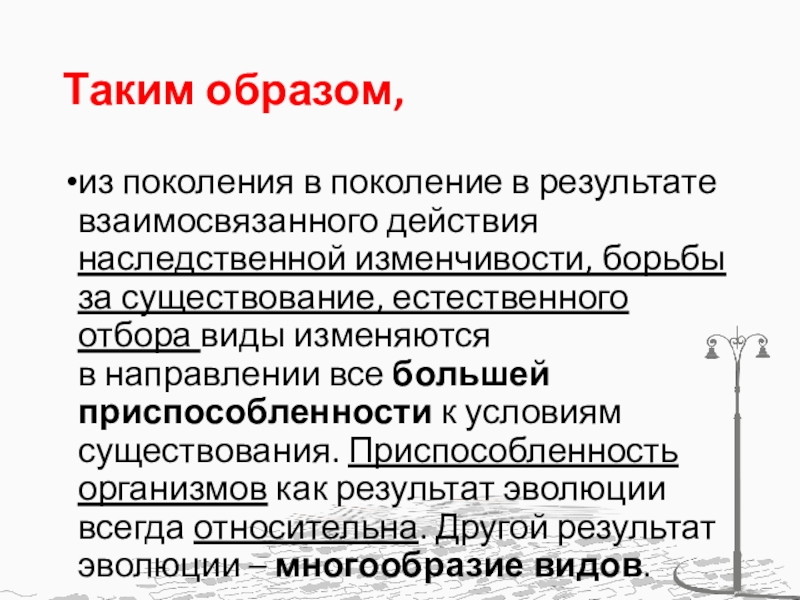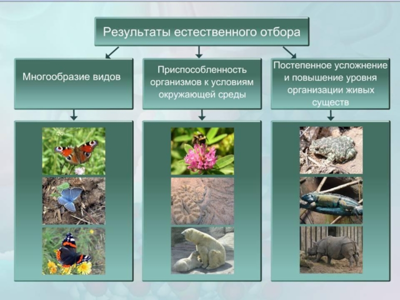 борьбы за существование, естественного отбора виды изменяются в направлении все большей приспособленности к условиям существования. Приспособленность организмов как результат эволюции всегда относительна. Другой результат эволюции – многообразие видов.