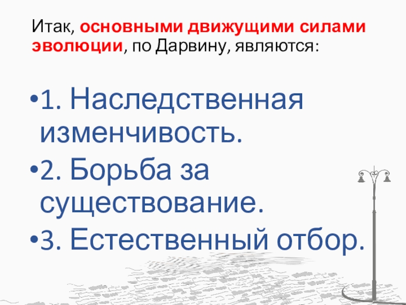 Слайд 11Итак, основными движущими силами эволюции, по Дарвину, являются: