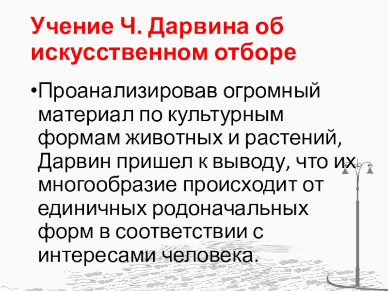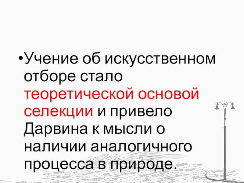 Слайд 49Учение об искусственном отборе стало теоретической основой селекции и привело Дарвина к