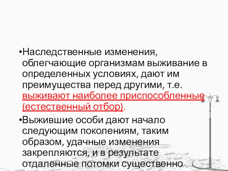 Слайд 10Наследственные изменения, облегчающие организмам выживание в определенных условиях, дают им преимущества