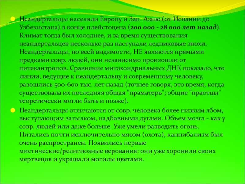 конце плейстоцена (200 000 - 28 000 лет назад). Климат тогда был холоднее, и за время существования неандертальцев несколько раз наступали ледниковые эпохи. Неандертальцы, по всей видимости, НЕ являются прямыми предками совр. людей, они независимо произошли от питекантропов. Сравнение митохондриальных ДНК показало, что линии, ведущие к неандертальцу и современному человеку, разошлись 500-600 тыс. лет назад (точнее говоря, это время, когда существовала их последняя общая "праматерь"; общие "праотцы" теоретически могли быть и позже).
