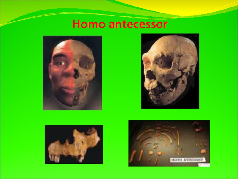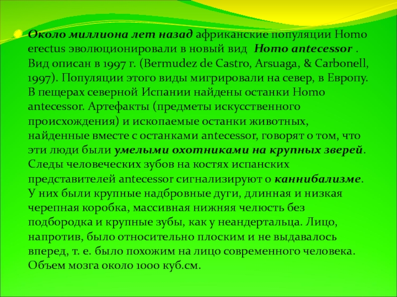 вид Homo antecessor . Вид описан в 1997 г. (Bermudez de Castro, Arsuaga, & Carbonell, 1997). Популяции этого виды мигрировали на север, в Европу. В пещерах северной Испании найдены останки Homo antecessor. Артефакты (предметы искусственного происхождения) и ископаемые останки животных, найденные вместе с останками antecessor, говорят о том, что эти люди были умелыми охотниками на крупных зверей. Следы человеческих зубов на костях испанских представителей antecessor сигнализируют о каннибализме. У них были крупные надбровные дуги, длинная и низкая черепная коробка, массивная нижняя челюсть без подбородка и крупные зубы, как у неандертальца. Лицо, напротив, было относительно плоским и не выдавалось вперед, т. е. было похожим на лицо современного человека. Объем мозга около 1000 куб.см.