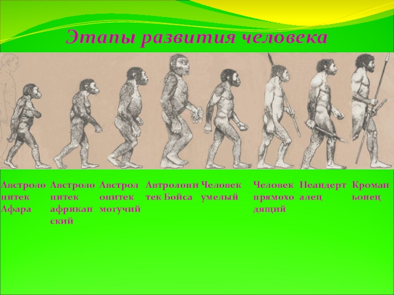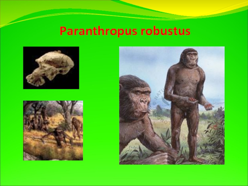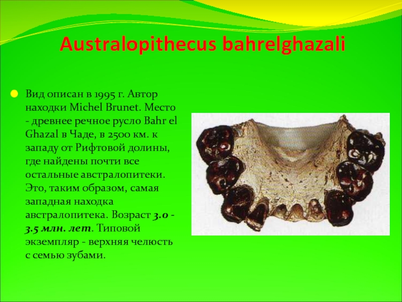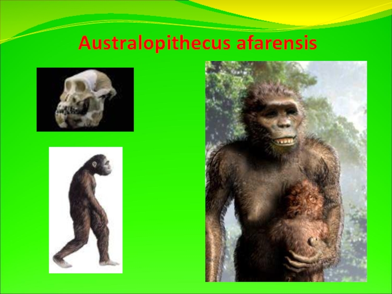 и, возможно, дал начало нескольким эволюционным линиям. Найдены остатки более 300 особей (в том числе известная "Люси"). Много "обезьяньих" признаков: вытянутое (прогнатическое) лицо, U - образное нёбо (с параллельными друг другу рядами коренных зубов, как у высших обезьян, в отл. от "параболического" нёба совр. человека); маленькая мозговая коробка (430 куб. см., ненамного больше, чем у шимпанзе). Но есть и много отличий от обезьян, главное из которых - хождение на двух ногах.