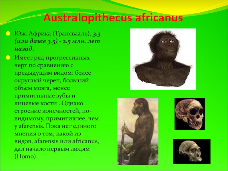 Имеет ряд прогрессивных черт по сравнению с предыдущим видом: более округлый череп, больший объем мозга, менее примитивные зубы и лицевые кости . Однако строение конечностей, по-видимому, примитивнее, чем у afarensis. Пока нет единого мнения о том, какой из видов, afarensis или africanus, дал начало первым людям (Homo).