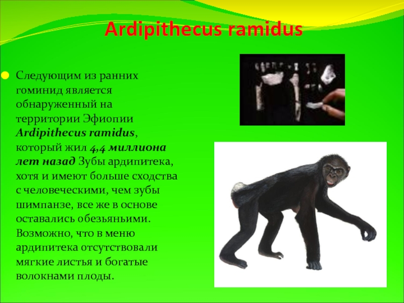 Следующим из ранних гоминид является обнаруженный на территории Эфиопии Ardipithecus